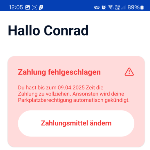 Falls deine monatliche Zahlung fehlgeschlagen ist, hast du zwei Arbeitstage Zeit, dein Zahlungsmittel zu ändern. Damit verhinderst du, dass deine Parkberechtigung verfällt. In diesem Fall siehst du auf dem Startbildschirm deiner App einen roten Warnhinweis. Über diesen Warnhinweis kannst du den Wechsel deines Zahlungsmittels starten.