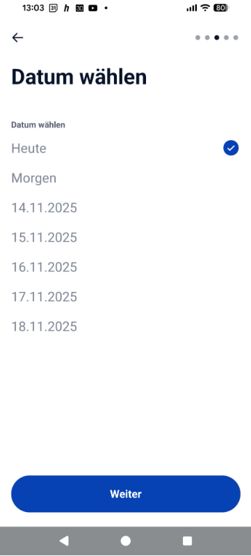 Wähle aus, an welchem Tag du das Tagesticket verwenden möchtest. Du kannst Tagestickets maximal 7 Tage im Voraus erwerben.